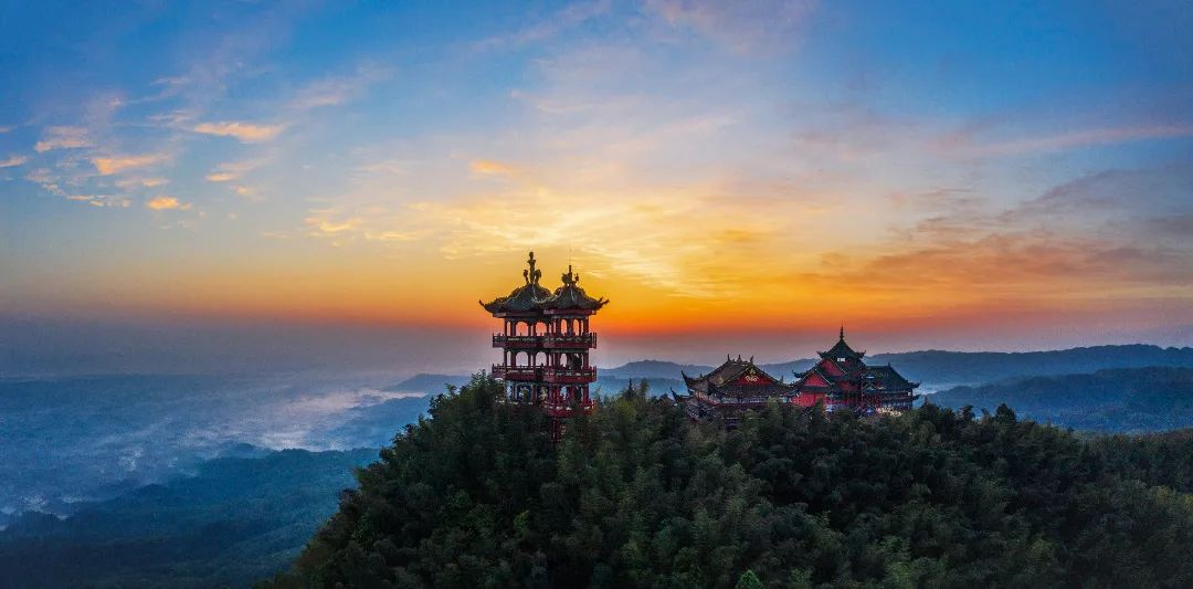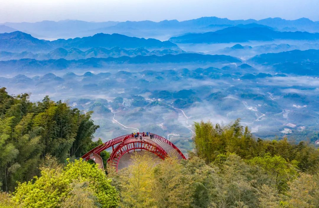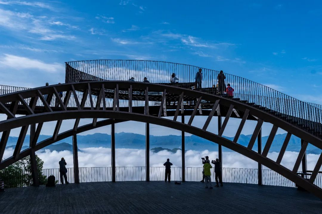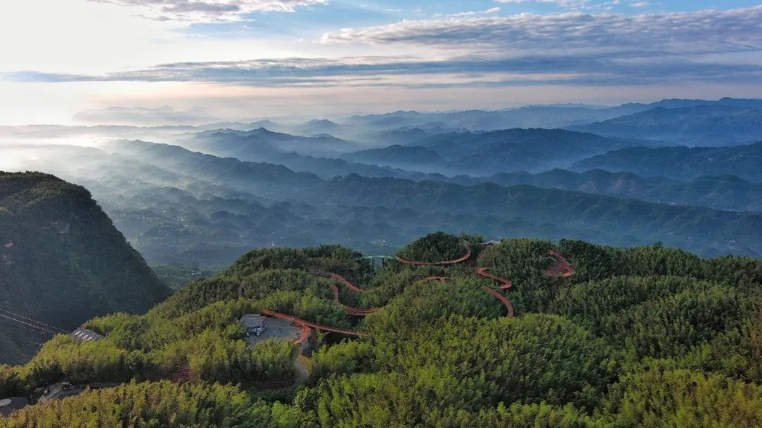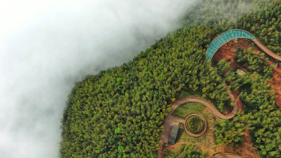 巍峨山脉与碧波环抱,浑然一体,且惊且险,云端处璀璨阳光的折射,山中云雾拂来之时,每一处场景都衬托出浪漫诗意的竹海情怀。