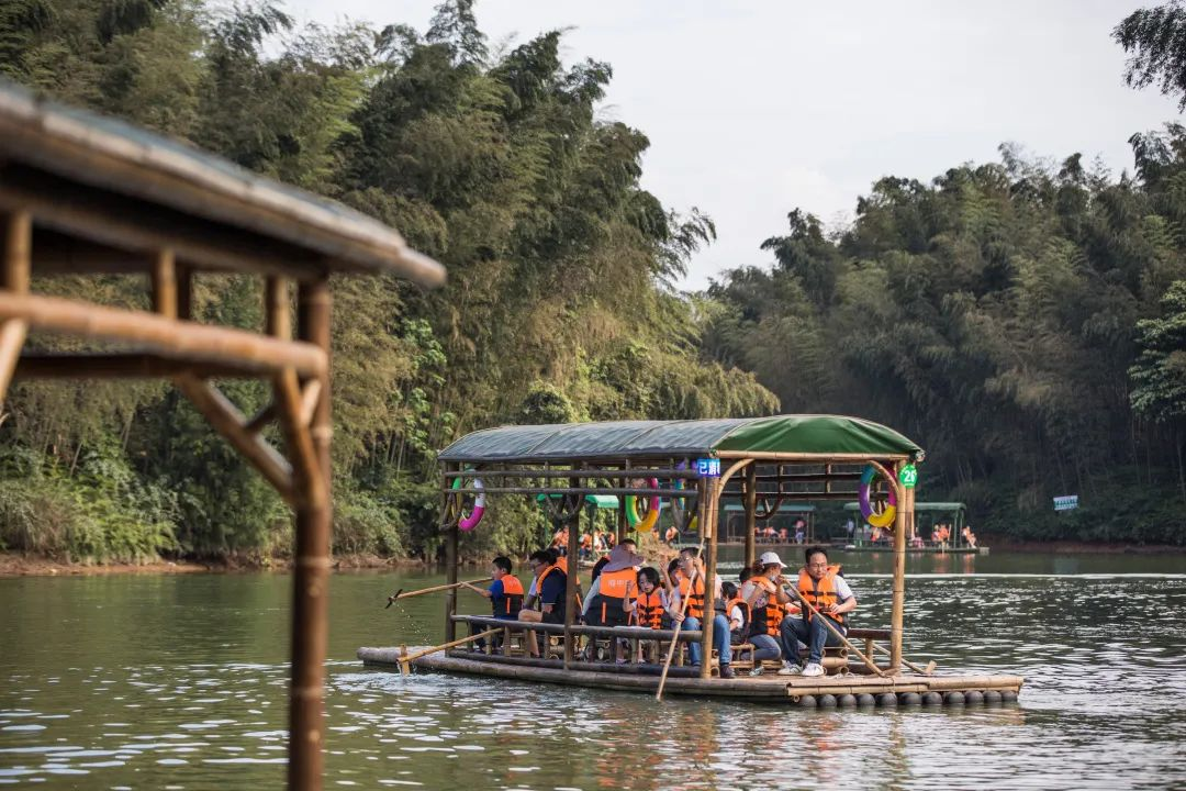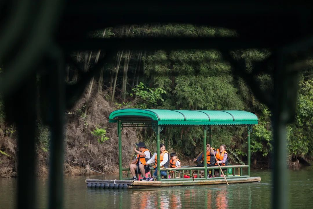 乘一叶竹筏,泛舟于波光粼粼的湖面中,一片片翠绿的竹海在岸边轻轻掠过......