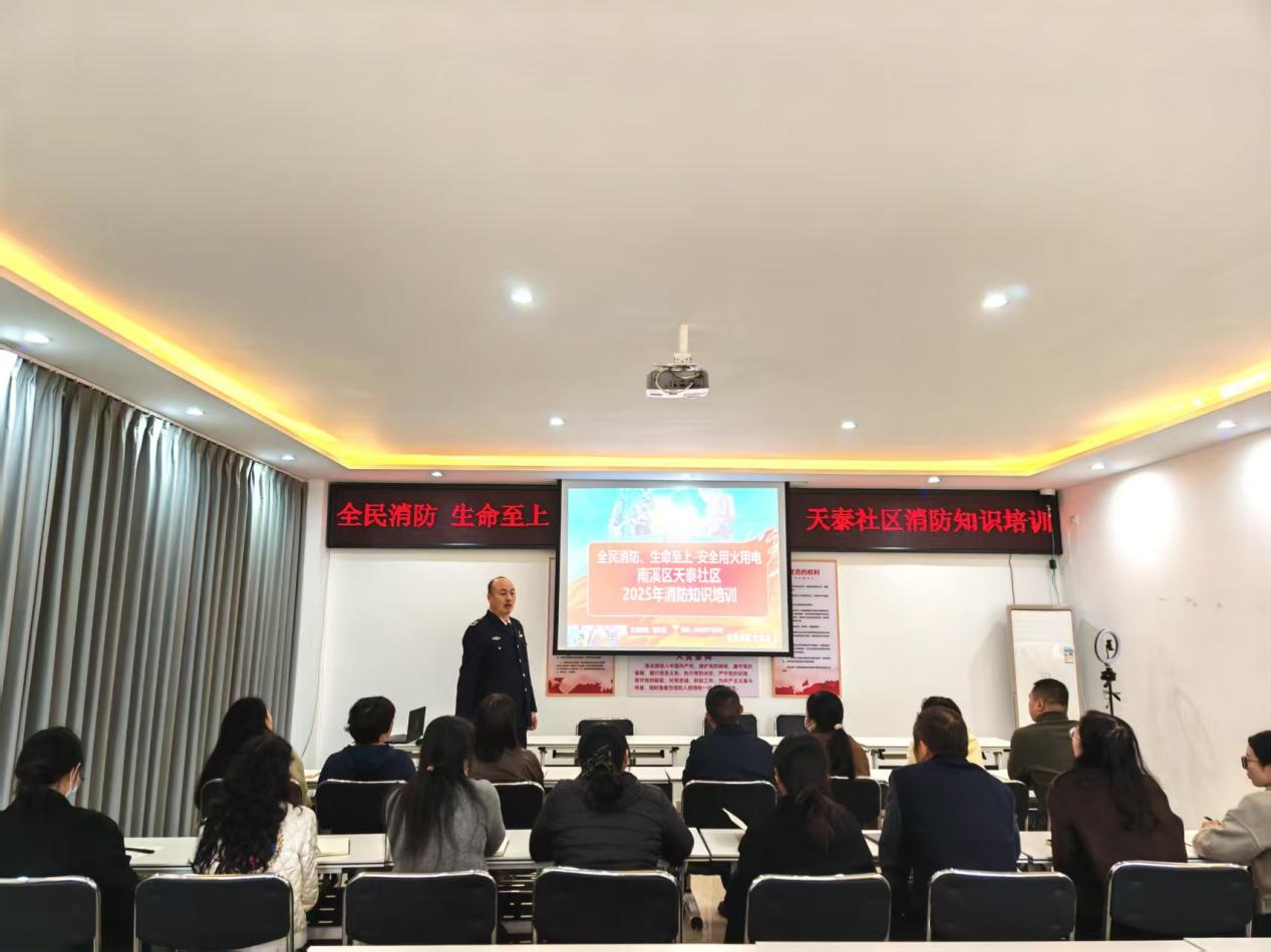 为切实筑牢社区消防安全防线,提升居民应急处置能力,在全国消防日来临之际,天泰社区特邀政宣消防杨教官到社区开展“全民消防,安全至上——安全用火用电”主题培训活动,辖区居民、商户代表等积极参与,现场学习氛围浓厚。