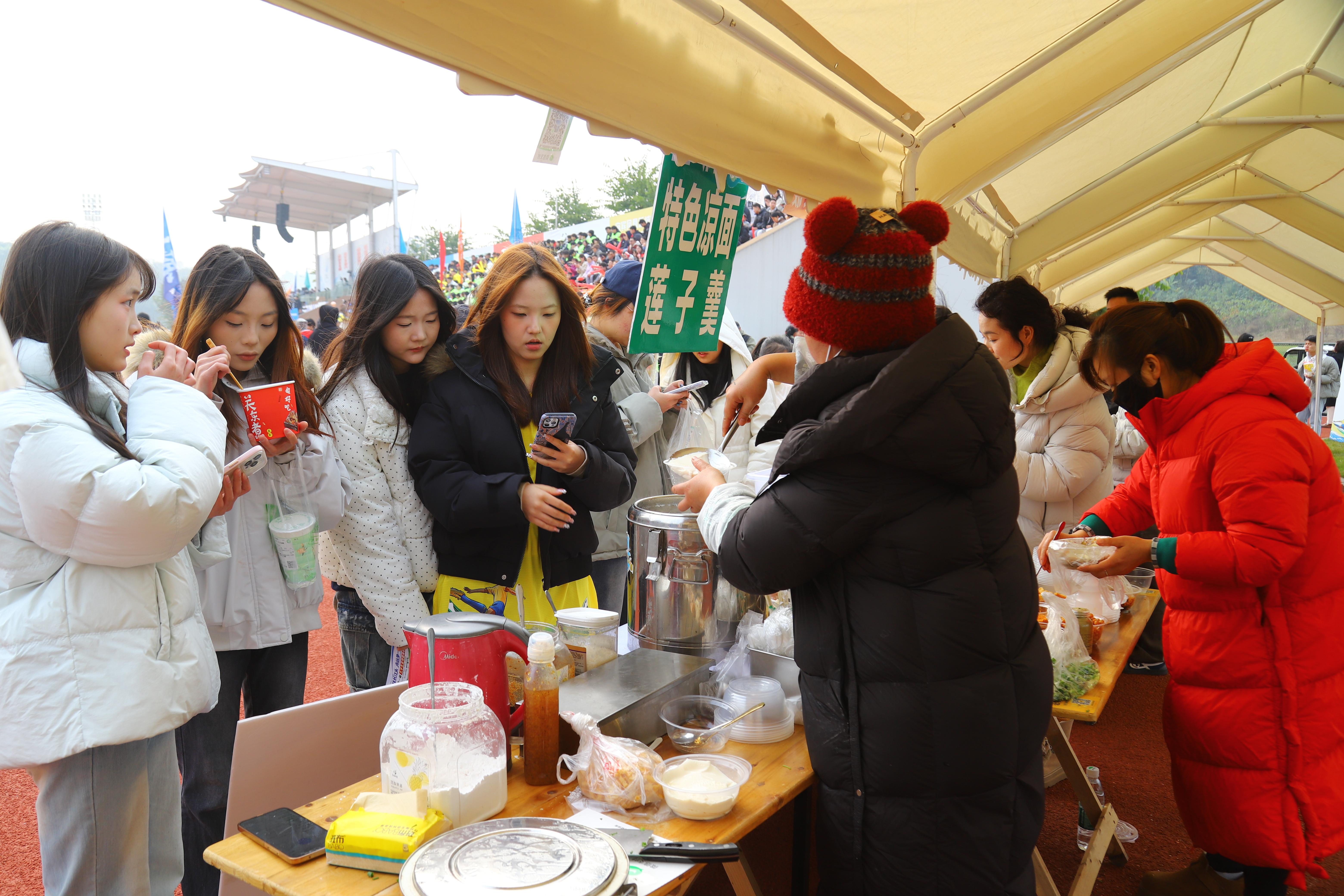 展销区内,各镇(街道)带来的农产品集中亮相,特色小吃、地方特产分区陈列,各类展位整齐分布。一串串色泽诱人的糖葫芦、一碗碗热气腾腾的豆腐脑等特色小吃扎堆摆放,诱人香气扑鼻而来,引得观赛者纷纷驻足聚集,边吃边逛,热闹非凡。另一侧的农特产品展示区内,南溪各类白酒、小黄粑、豆腐干、鹅肉干等特产有序陈列,吸引大量观赛者驻足细看。大家提着选购的商品穿梭其间,整个展销区采购氛围格外浓厚,处处洋溢着热闹的烟火气。