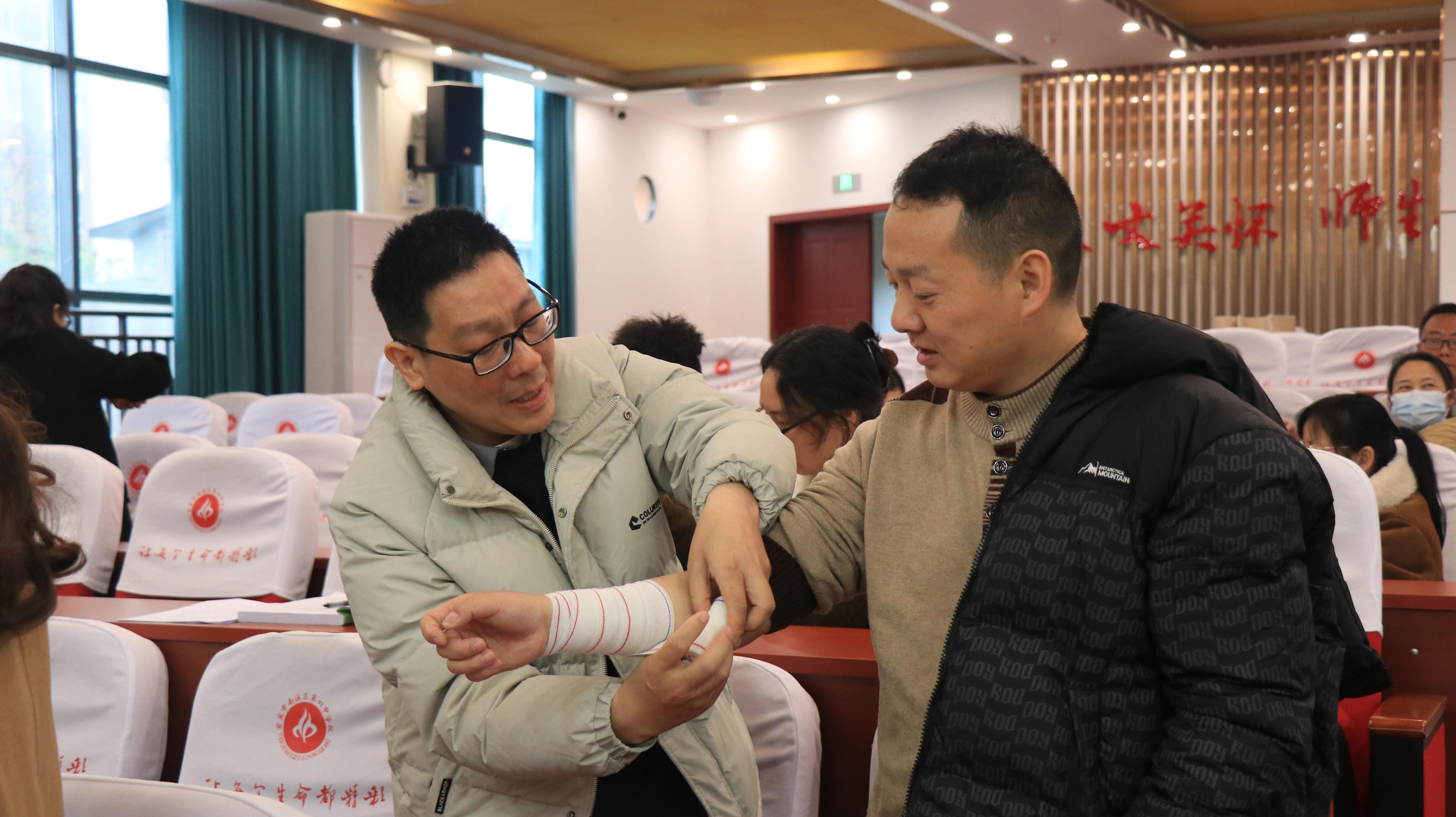 培训现场,区红十字会的授课讲师围绕校园高频突发场景,聚焦心肺复苏、创伤救护、意外伤害应急处置等核心内容,开展系统全面的教学。授课过程中,讲师结合真实的案例拆解急救要点,用通俗的语言讲解急救原理,通过现场示范、一对一纠正指导,带领参训学员分组实操,重点规范心肺复苏的按压深度、频率,以及创伤包扎手法、海姆立克急救法的动作要领。现场还通过实操测试,确保每一位学员都能真正掌握急救技能,把“纸上知识”转化为“实战能力”。