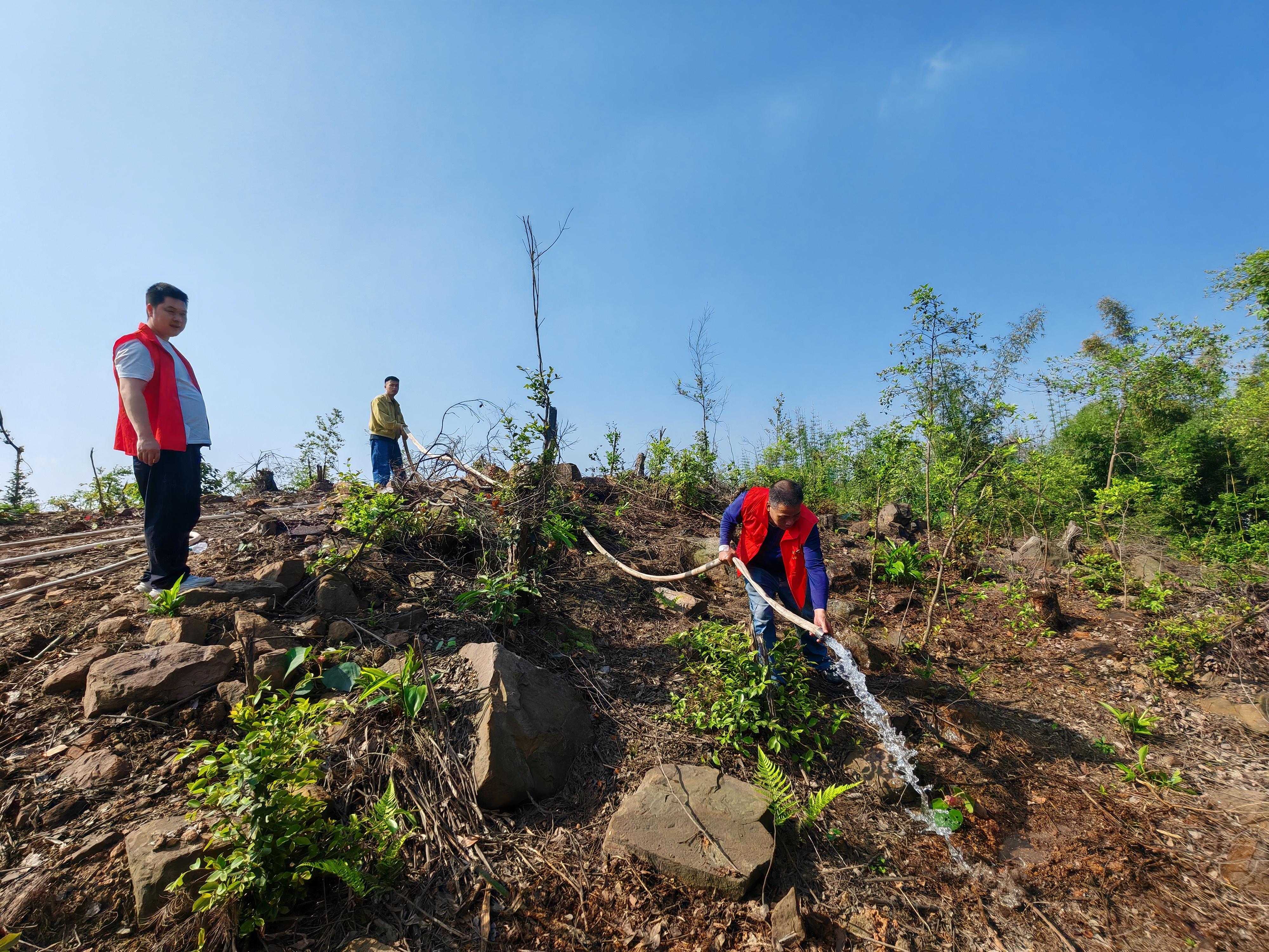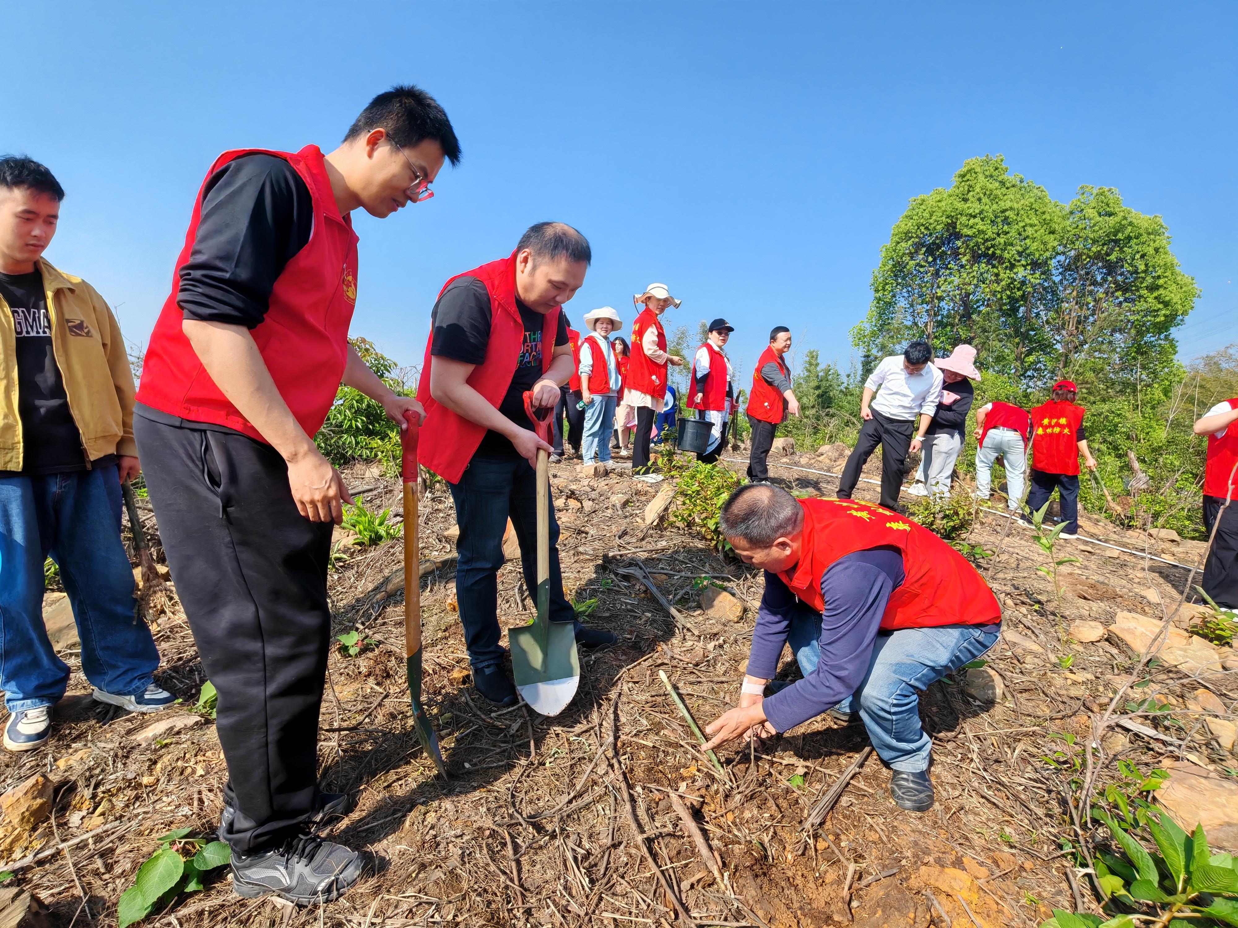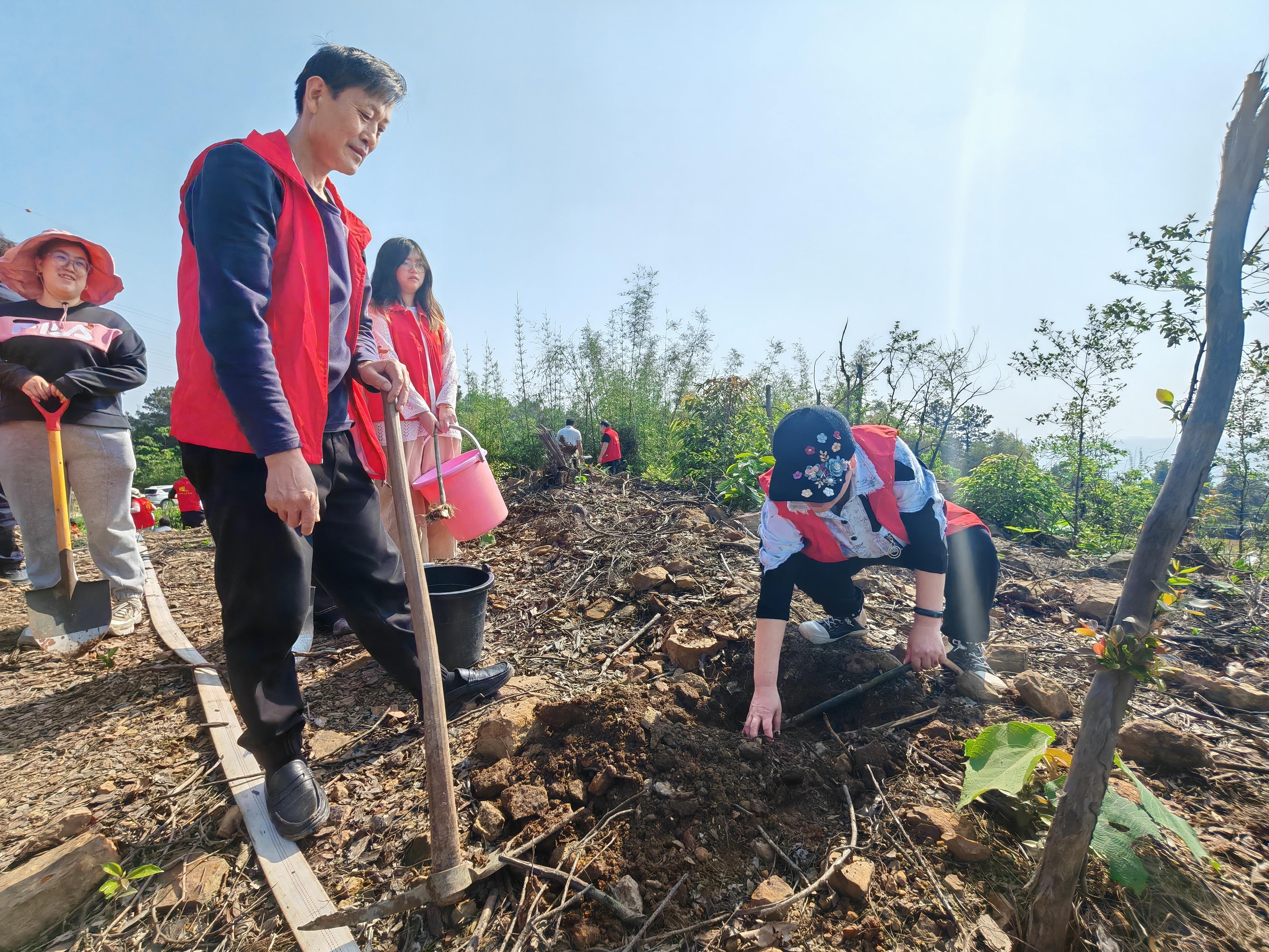 挥锹铲土、扶苗正根、培土压实、提水浇灌……大家分工协作、配合默契,现场一派热火朝天的劳动景象。“坑要挖标准、土要踩紧实,确保每棵竹苗都能成活!”老党员带头示范,年轻干部干劲十足,汗水浸湿了衣衫,笑容却洋溢在脸庞,一棵棵竹苗在大家的精心栽种下扎根沃土、迎风挺立。