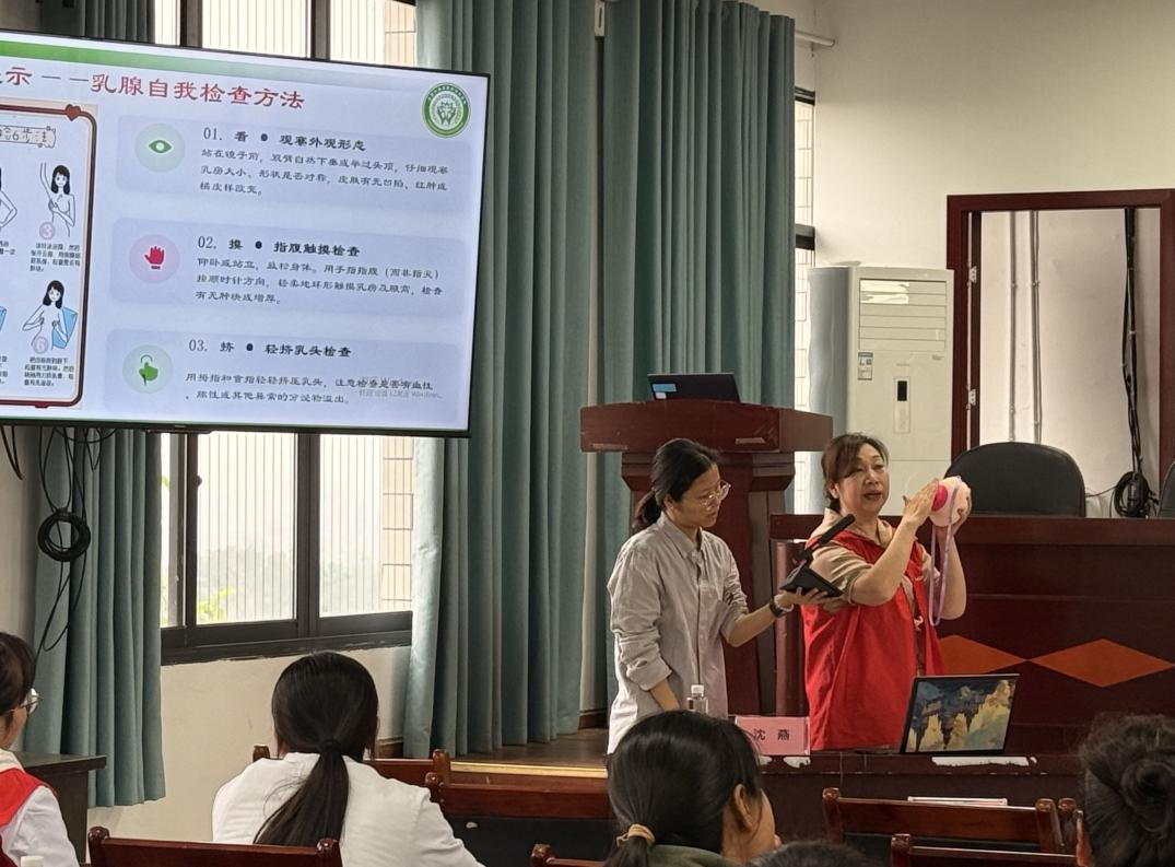 活动伊始,沈燕老师以“早防早筛早治同心携手抗癌”为主题,开展女性“两癌”防治科普宣讲。为让枯燥的医学知识更易被理解和接受,沈燕老师采用图文展示、现场道具演示相结合的方式,用通俗易懂的语言,详细讲解了乳腺癌、宫颈癌的发病特点、早期症状及危害,重点演示了乳腺自我检查的正确方法和注意事项,手把手指导参会人员掌握自我筛查技巧。同时,针对宫颈癌的预防要点,沈燕老师结合临床案例,强调了定期进行“两癌”筛查的重要性,引导女性树立“早发现、早诊断、早治疗”的健康理念,主动远离“两癌”风险,筑牢自身健康第一道防线。
