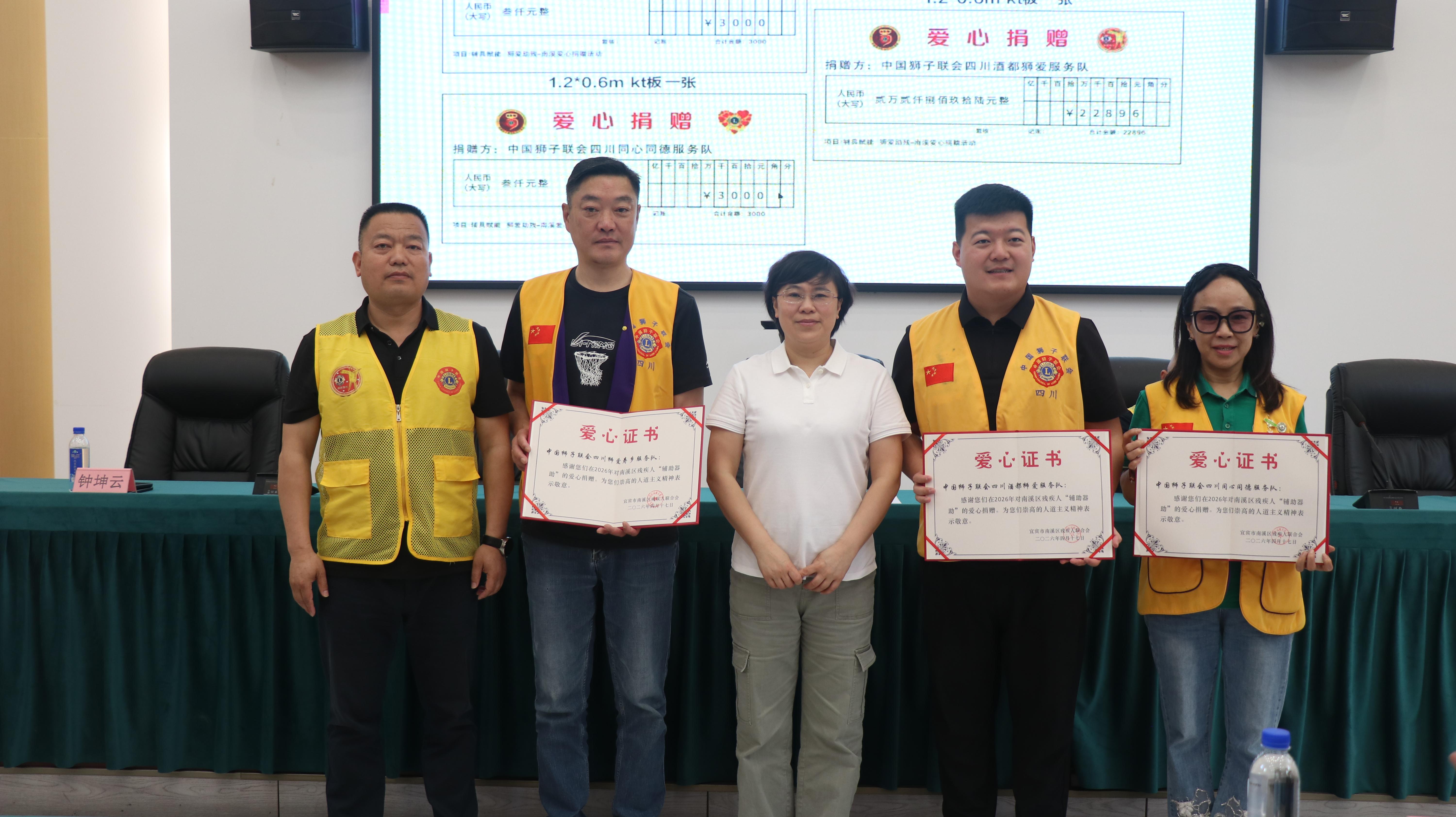 活动现场,中国狮子联会四川酒都狮爱服务队、狮爱寿乡服务队、同心同德服务队三支爱心队伍携手发力,向区残联捐赠了轮椅、腋拐等一批实用辅助器具。区残联现场为三支爱心服务队颁发荣誉证书,以此感谢他们的公益精神与暖心善举。